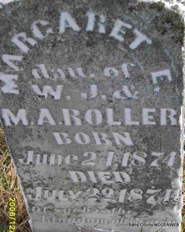 | ROLLER, Margaret E. | June 24, 1874 | July 22, 1874 | Inscription: "Dau. of W. J. and M. A." | Photo Deceased Beverly Sweeney |