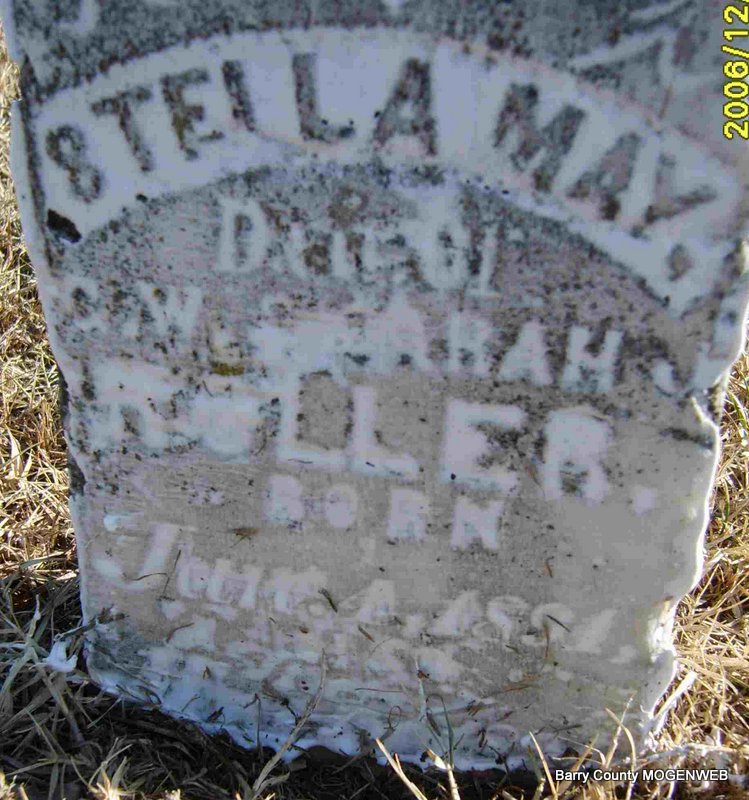 | ROLLER, Maud Jean | Sept. 2, 1875 | Sept. 18, 1896 | Research Note: Wife of Harlan Roller. - Cassville Republican, Thursday, September 24, 1896 - Died: Maude, wife of Harlan Roller. Burial was in New Salem Cemetery. Harlan second married Lillie McNatt on Aug. 3, 1899 in Barry Co., MO. | Headstone Bubby Joe Edens Online Obit Phyllis Long |