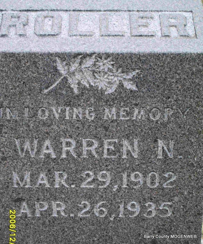 | ROLLER, Warren N. | Mar. 29, 1902 | Apr. 26, 1935 | Inscription: "In Loving Memory" - Research Note: Son of Sill Vester Roller and Susa Roller. - Aug. 31, 1916, Thursday, Cassville Republican - New Salem: Warren Roller has been sick the past few days with diphtheria but is getting along nicely. Mrs. Nota Wasson and Mrs. Floyd Roller's babies have also had diphtheria. | Mother's Obit Online Newspapers Phyllis Long Photo Deceased Beverly Sweeney |