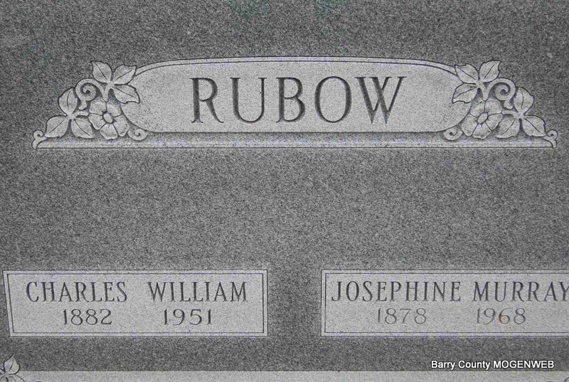 | RUBOW, Charles William | 1882 | 1951 | SSW: Josephine - Research Note: Son of William Rubow and Hannah March. - July 22, 1915, Thursday, Cassville Republican -Personal and Local: Chas. Rubow and sisters, Mrs. Mary Collier and Miss Jessie Rubow and Mrs. Laura Roller of Seligman were at the county seat Wednesday of last week. - October 16, 1913, Thursday, Cassville Republican - Big Springs News: Mr. Rubow and daughter, Jessie, Grandma Murray and Miss Sada Dotson visited at Charley Rubow's at Seligman Sunday. - William and Hannah came from Prussia aka East Germany. They were naturalized in 1878. the family moved from Bibley, IA to Seligman in 1889. Charles was postmaster from 1906-1915. Then he was associated with the Finn Brothers in the mercantile business until 1918 when he became sole owner. | Census Online Newspapers First Century of Seligman Phyllis Long Photo Deceased Beverly Sweeney |
