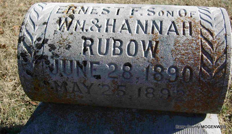 | RUBOW, Ernest F. | June 28, 1890 | May 25, 1892 | Inscription: "Son of Wm. and Hannah Rubow" | Photo Deceased Beverly Sweeney |