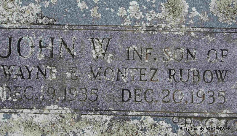 | RUBOW, John W. | Dec. 9, 1935 | Dec. 20, 1935 | Inscription: "Infant son of Wayne and Montez" - Research Note: Grandson of Charles and Josephine Rubow. | First Century of Seligman Phyllis Long Photo Deceased Beverly Sweeney |