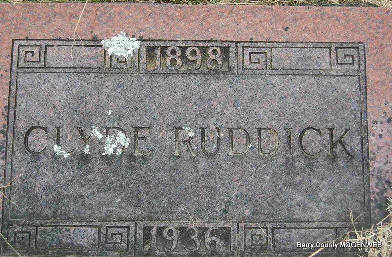 Research Note: He was a grocery merchant and his wife was Effie Roller. Son of Lafayette Ruddick and Lurinda Cox, both born AR. Effie was the informant on the death certificate. Indexed as Clyde Ruddich. - Cassville Republican, Thursday, January 2, 1919 - Norman Trimble who is attending school at Springfield spent the holidays with his parents, Mr. and Mrs. T. L. Trimble. He returned to Springfield the last of the week accompanied by Clyde Ruddick who will also enter school at that place. - Headstone | Death Certificate Online Newspapers Phyllis Long Photo Deceased Beverly Sweeney |