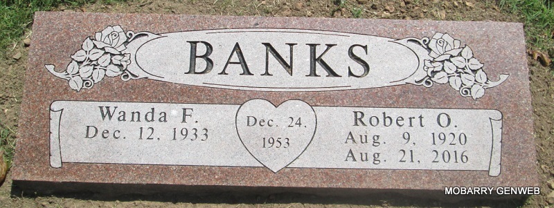 SSW: Robert O. - Inscription: "Married Dec. 24, 1953" - Research Note: She was the daughter of Cecil and Beadie (Renfroe) Dearman. She married Robert O. Banks Sr. December 24, 1953, at Mt. Vernon, MO. She was preceded in death by her husband Bob, her parents, one brother, two sisters and two great grandchildren. Wanda grew up the daughter of an Oklahoma sharecropper and made the Okie migration to California during World War II where she attended schools in Richmond CA while her father built liberty ships in the great Kaiser shipyards. She followed an older sister to Monett in 1951 and called Monett home for 69 years, working at Hatcher's Café, Efco and Moss Market. She was cook at the New Vista rural school in the 1960s and a home service aide for Monett Head Start for several years thereafter, then she and her husband Bob owned a popular antique store for many years. After retiring from her own store, she worked part time at the V. B. Hall Antique Mall until the last year of her life. On several occasions over the years, she and Bob opened their home and hearts to local youngsters in need of shelter and were informal parents to many. She was an active member of the New Site Baptist Church, where she often drove for the church bus ministry. | Bennett-Wormington Funeral Home Phyllis Long Photo Bob Banks |