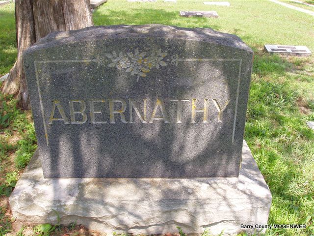 Research Note: He has a separate stone from his wife Annis. Birth place and parents marked not known on the death certificate. H. O. Abernathy of Pierce City, MO was the informant. Son of Solon Blackstone Abernathy and Lucinda Elzira Parr. - August 15, 1903, Saturday, Cassville Democrat - B. Abernathy and John Banks of Capps Creek township, spent a few days on Roaring River last week fishing. - August 21, 1911, Thursday, Cassville Republican - Mr. and Mrs. H. O. Abernathy motored to Pierce City Saturday for a visit with Mr. Abernathy's parents, Mr. and Mrs. Blackstone Abernathy. They were accompanied by Mrs. C. H. Hadley and Mrs. C. W. Beaver who visited their parents, Mr. and Mrs. J. B. Hudson. Blackstone was the son of Solon Blackstone Abernathy and Lucinda Elzira Parr. - Plot Stone | Death Certificate Online Newspapers Census Phyllis Long Photo Donna Cooper Darla Marbut |