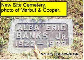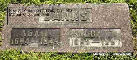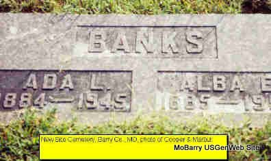 SSW: Ada - Research Note: Son of William and Margaret Chastina (Baird) Banks. Alba and Ada are buried near the entrance and near the message box. In 1900 Alba Banks was listed in Barry County, MO, Capps Creek as age 14. | Census Photo Donna Cooper Darla Marbut |