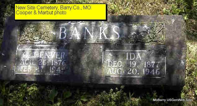 SSW: Ida - Research Note: Son of John Banks and Rachel Haddock born Barry Co., MO. Mrs. George D. Banks of rural Carthage, MO was the informant on the death certificate. - December 14, 1916, Thursday, Cassville Republican - Washburn Prairie: John Banks of Monett visited his brother, Denver Banks, and family here from Thursday till Sunday. - September 1, 1917, Saturday, Cassville Democrat - Forty one years ago, August 26, there was born a "kid" at the home of a mighty good man in the person of the late John Banks, who lived in Capps Creek township at that time. They called the newly arrive babe "Denver" and the reason why was never been explained, yet that black headed and eyed babe was allowed to grow to boy and manhood and continues to survive and is doing well on his farm on Washburn Prairie, where he is surrounded by good neighbors like Monroe Logan, Sol Sparkman, Thos. Trolinger, Keet LeCompte, Grat Reese, John Varner and others that are evidently his friends and well wishers. Last Sunday a great host of relatives and friends met at his home and administered such a good feeding to him and all the hosts that had assembled on this happy occasion, that he is not going to soon forget this kindly remembrance of their thoughtfulness, which afforded Denver and family much pleasure and satisfaction. The day was a happy one and will long be remembered by Mr. Banks and family and all the visitors. - Cassville Republican, Thursday, April 3, 1919 - Denver Banks has bought the old William Varner farm which adjoins Mr. Banks on the east. He got all the tract except 15 acres where the house is located, Mr. and Mrs. Banks have re-considered and mean to remain on their farm. They had thought of moving to California. - Cassville Republican, Thursday, Oct. 10, 1918 - Mr. and Mrs. G. D. Banks were called to Springfield Saturday night on account of the serious illness of their son, Orville, with influenza. Lawrence Jayne is also sick there with the same disease but not so serious. His parents, Mr. and Mrs. C. N. Jayne also went to attend him. - Cassville Republican, Sept. 4, 1919 - New Site: G. D. Banks and family of Washburn visited J. G. Phillips Saturday night and Sunday. | Death Certificate Online Newspapers Phyllis Long Photo Donna Cooper Darla Marbut |