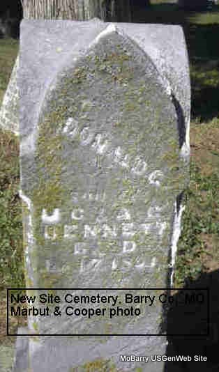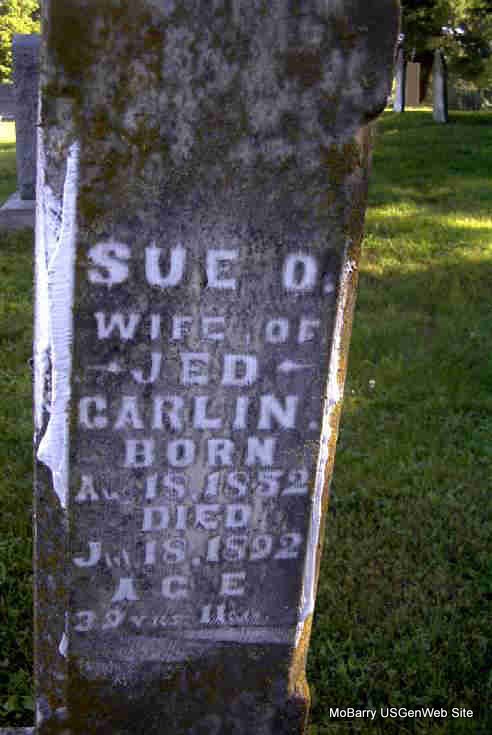 Research Note: Son of Asa and Maria (Gifford) Carlin - In 1880, on the Federal Census, he was living next door to his parents and was age 30. His wife Susan was age 27. - Cassville Democrat, July 22, 1905 - The announcement of the death of Jediah Carlin, at his home in Purdy, Sunday morning, was received with sadness in this city, where he was so well known. Jed was a son of Asa and Maria Carlin, who came to Barry County, in 1856, from Virginia and settled on Stone's Prairie, where they raised a large family. Jed was a brother of Wm. M., Mrs. Thos. P. Withers of near Monett, Thos. M. Carlin of Pierce City, Rev. Abe Carlin of Tulsa, I. T., and the late Gilbert L. Carlin, who was county clerk, circuit clerk and recorder of this county, Mrs. Luther Brown of this city, and Mrs. Eva Johnson of Oklahoma, and the late Halleck Carlin. The remains were laid to rest Monday in the New Site Cemetery. Mr. Carlin was married twice, the first time to Miss Susan Horine, who died; she was a sister of Mr. and Mrs. Harry Horine of this city and Hiram Horine of near Monett. His second marriage was with Miss Fanny Archibald who survives him. He had been a member of the Baptist Church for many years. He was a good citizen and enjoyed the respect and confidence of his acquaintances. Purdy and Barry County has lost a good citizen. - July 22, 1905, Saturday, Cassville Democrat - Scott Archibald and his sister Mrs. Jed Carlin and Oscar Horine of Purdy were in this city on Wednesday. - August 5, 1905, Saturday, Cassville Democrat - Purdy News: Scott Archibald has resigned his position as head nurse at the Frisco hospital in Springfield and returned to Purdy to take charge of the Jed Carlin grocery store. | Online Obit Online Newspapers Phyllis Long Note Census Photo Donna Cooper Darla Marbut |