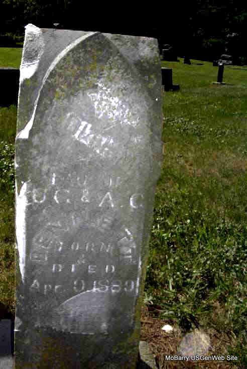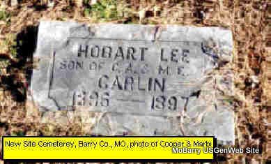 Inscription: "Son of C. A. and M. E. Carlin" - Research Note: Charles Asa and Minerva E. (Hayes) Carlin were his parents. He was a great grandchild of Charles and Sarah (Collins) Haddock. - July 8, 1897, Cassville Republican - New Site News Items: Died, June 30th, Lee, infant son of Mr. And Mrs. C. A. Carlin. He had been suffering for some time with whooping cough. The bereaved parents have the sympathies of a host of friends. | Online Newspapers Phyllis Long Note Photo Donna Cooper Darla Marbut |