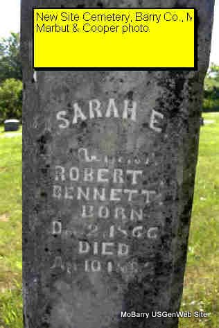 | BENNETT, Sarah E. | Dec. 2, 1866 | Apr. 10, 1892 | Research Note: Wife of Robert Bennett. | Note Photo Donna Cooper Darla Marbut |