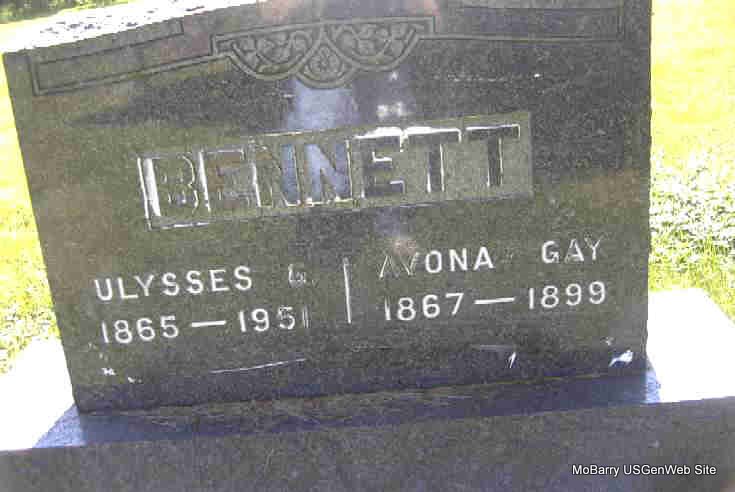 SSW: Avona Gay - Research Note: Son of Dexter Galer Bennett and Sarah Saulsberry. First wife was Avona Gay Withers and second wife Margaret Smith (according to census, her maiden name was Stansbury). Divorced at the time of his death. Listed as single in the 1940 census. Leophas Bennett of Monett, MO was the informant on the death certificate. In 1880, on the Federal Census, Grant Bennett was listed as age 14 and born in MO. D. G. Bennett was a farmer from Virginia. Sarah was born in PA. - March 25, 1905, Saturday, Cassville Democrat - Married Sunday by Rev. J. T. Brattin, U. G. Bennett and Miss Margaret Smith of near Rocky Comfort. Ulysses Bennett, age 38, married Margaret Stansbury, (name different on marriage certificate) age 28, in Mar. 1905 in Barry Co., MO. - September 12, 1912, Thursday, Cassville Republican - Octogenarian Birthday: Eighty years age on the date of Aug. 30, 1832, there was born into this world a child who was christened by the name of Galer Bennett. On the eightieth birthday of Mr. Bennett, four generations of which he is the head, with many friends and relatives meet at his home in Purdy to celebrate the occasion. At the noon hour a bountiful dinner was spread and the occasion was pleasantly enjoyed. Of the immediate family, 6 children, 16 grand-children and 11 great-great children were present. They are: D. G. Bennett, Dr. and Mrs. Freeland, W. B. Counts and family, Mrs. A. V. Stephenson and son Bud Campbell of Purdy; Mrs. A. D. Campbell of Fairview; Mr. and Mrs. L. Looney and son of Richey; Doras Bennett, Syble Bennett and Grant Bennett and family of Monett; Mrs. O. F. Tate and children, R. T. Saulsbury and daughter, Alice, Mr. and Mrs. R. T. Bennett, Mr. and Mrs. J. F. Watson and Perry Carmichael of Pierce City; Mrs. S. L. Boyd and daughters of Neosho; Mrs. Martha Wilson of Carthage and Mr. and Mrs. J. C. Carney of Galena, Kansas. | Death Certificate Online Newspapers MO Marriage Records Phyllis Long Census Photo Donna Cooper Darla Marbut |
