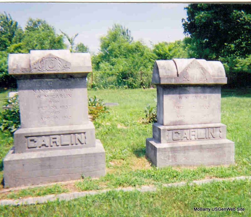 Research Note: Son of Acy and Maria (Gifford) Carlin. - April 6, 1916, Thursday, Cassville Republican - New Site News: Mrs. Samantha Hudson of Arkansas is visiting her father, Marshal Carlin, who still remains in a critical condition. - April 13, 1916, Thursday, Cassville Republican - New Site News: Wm. Marshall Carlin was born in West Va., Dec. 18, 1839. Died April 5, 1916, age 76 years, 3 months and 23 days. He came to Missouri with his parents at the age of 14 years and settled on a farm southwest of Monett. He was married to Nancy Haddock, July 28, 1859, since which time he has lived on the farm where he died near where his father settled. To this union was born 9 children, eight boys and one girl all of whom are living and were present at his bedside when he died. They are LaFayette of Joplin, Chas. A., Britt and Pleasant of Monett, Sherman of Purdy, Rev. Thos. of Sawyer, Kan., John of McDonald County, Mrs. Samantha Hudson of Jasper, Ark., and Rev. Luther of Fairview. There are 44 living grandchildren and 13 great grandchildren. Mrs. Carlin died 4 years ago and later he was married to Mrs. Margaret (Rumbaugh) Russell of Eagle Rock who still survives him. He was converted at the age of 12 years and united with the Baptist Church of which body he was a faithful and consecrated member all through life. During the late Civil War he enlisted at Springfield in Co. L. of the First Ark. Cavalry in 1862 in which company he served faithfully until mustered out at Fayetteville, Ark. in 1865. He has been sick since last October suffering intensely with cancer of the bowels. Until a few years ago, he besides farming, dealt extensively in cattle. He was widely known and will be greatly missed. Funeral services were held at New Site Thursday at 2 p.m., attended by a large crowd of relatives and friends. The remains were laid to rest by the side of his first wife in New Site Cemetery, Eld, C. M. Smith of Exeter conducting the services. The bereaved ones have our deepest sympathy in this their hour of trial but they sorrow not as those who have no hope for he has just gone on before and some glad day they will meet again where partings are unknown. - Another Obit - April 13, 1916, Thursday, Cassville Republican - Prominent Farmer Passes Away: William Marshall Carlin Died April 5, Age 76 years - In Feeble Health Many Months - Marshall Carlin, one of the best known farmers in Barry County, died after a lingering illness Wednesday, April 5, 1916, at his home southwest of Monett. His funeral was held Thursday at New Site Baptist Church where he had been a member of many years. The funeral was largely attended by citizens from all parts of that section of the county which was a strong testimonial of the esteem in which he had been held. William Marshall Carlin was born in Harrison County, Va., on December 19, 1839. He came with his parents to Barry County in 1856 where he continued to make his home until death. His father, Rev. Asa Carlin, was a well known minister of the Baptist Church. The family located on Stone's Prairie. There he was married in 1859 to Nancy Haddock and located on a farm of his own in what is now the New Site locality. By industry and good management he prospered and became one of the leading farmers and stockmen in this county. His first wife died a few years ago. Later he married Mrs. Margaret Russell. She and the following children are living: W. S. Carlin of Purdy, C. A., Brit, Pleasant and Rev. Luther Carlin of near Monett, Rev. Thos. S. of Kansas, John F. of McDonald County and Mrs. Samantha Hudson of Arkansas. When the Civil War broke out he enlisted in the Union Army in Company L. of the First Arkansas Cavalry and served for three years. After the close of the war he returned to his farm and devoted his attention to it and to dealing in live stock. Few citizens of the north part of the county were better known over the county than was Marshall Carlin. He was a successful farmer and a splendid citizen, and excellent neighbor and one of the county's pioneer citizens who was a valuable example to the later generations who have shared the many advantages resulting from the labors of those who blazed the way for the county's present progress. - April 13, 1916, Thursday, Cassville Republican - Carlin Will Probated: The will of Marshall Carlin was probated in the office of Judge C. M. Landis Tuesday by attorney Thomas Carlin and T. C. Ecroud of Pierce City who were the witnesses to the will. They were accompanied by Pleasant Carlin who is named executor in the will. The will was dated July 1913. It is a brief document and make the following disposition of property. To Mrs. Margaret Carlin the nw 1/4 of the ne 1/4 of Sect 13-25-28, $500 in money, one horse, one cow and two hogs, all of her own selection and also all the household goods and kitchen furniture. The remainder of the property both personal and real, is left to the nine children, all to share equally. Pleasant Carlin is made executor with bond. - Cassville Republican, Barry County, MO Newspaper, Feb. 1893 - Capps Creek News: Marshal Carlin sold 120 head of steers at $17.50 per head, and is now buying hogs and calves. - Goodspeed's History of MO, page 1081. - [Original copy of book in ownership] William Marshall Carlin, son of Asa and Maria Carlin, and one of the most prominent farmers of Barry Co., MO, was born in Harrison Co., VA, on December 19, 1839. In 1856 he came with his parents to Barry Co., MO, and remained with them until he was twenty years of age. Then when he married, he settled where he was living in 1888. William Carlin built the mill at Purdy, MO in 1885. On July 28, 1859, he was united in marriage with Nancy Haddock, who was born on February 25, 1859. Her father was Charles Haddock, one of the first settlers of the county. He was a farmer and stock raiser, and a very prominent citizen. To William Marshall Carlin and wife Nancy Haddock Carlin were born nine children. They were Harrison L., Charles A., Will