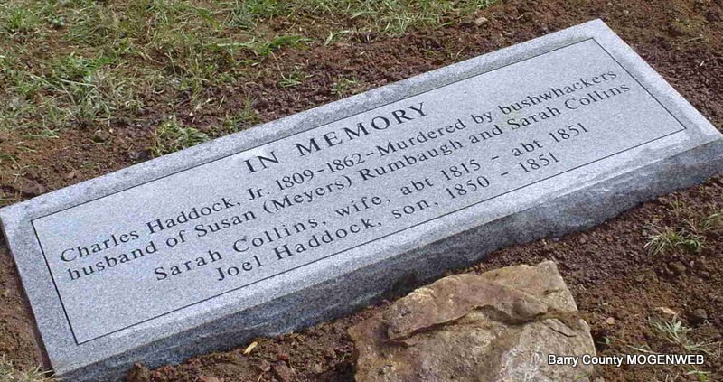 Inscription: "IN MEMORY - Charles Haddock Jr. 1809-1862 Murdered by bushwhackers, husband of Susan (Meyers) Rumbaugh and Sarah Collins." - Research Note: Maredia Haddock of findgrave.com says that he was the son of Charles Haddock (1780 - 1859) Penelope Mills (1784 - ____). Charles Haddock married Sarah Collins on Aug. 14, 1830 in Boone Co., MO. - Charles lived in the Walnut Grove Community - Not far from New Site Cemetery on a farm in the Hudson Bottoms. One story about Charles Haddock, Jr. states that he was killed by bushwhackers in Arkansas. And that he had gold that he collected from the government - maybe the Union Army - and the bushwhackers found out about it and set out to find him and take it. Another family story states that Charles Haddock, Jr. had gone to AR to deliver horses or to sell horses, and according to family legend, he was killed by Union soldiers. Both stories state that his slave, or a free black man, Steve, brought him home and that he was buried at the Walnut Grove Yard [New Site]. Both stories state that Steve took a mule to Arkansas and collected the remains and buried his remains at Walnut Grove. New Site Church listed his death date as 16th July 1862. That record is probably the correct death date for Charles and it states that he died south. The early records listed the cemetery as the Walnut Grove Cemetery Yard. In the beginning the church was called New Site but the cemetery was still going by the name of Walnut Grove up into the early 1900's. It wasn't until later that they began calling it New Site. Family lore says that Charles Haddock, Jr., was buried next to Sarah and there is an unmarked grave next to her. Susan, his second wife, was buried near her children and near her son, Solomon Rumbaugh's grave. | MO Marriage Records Phyllis Long Note Photo Donna Cooper Darla Marbut |