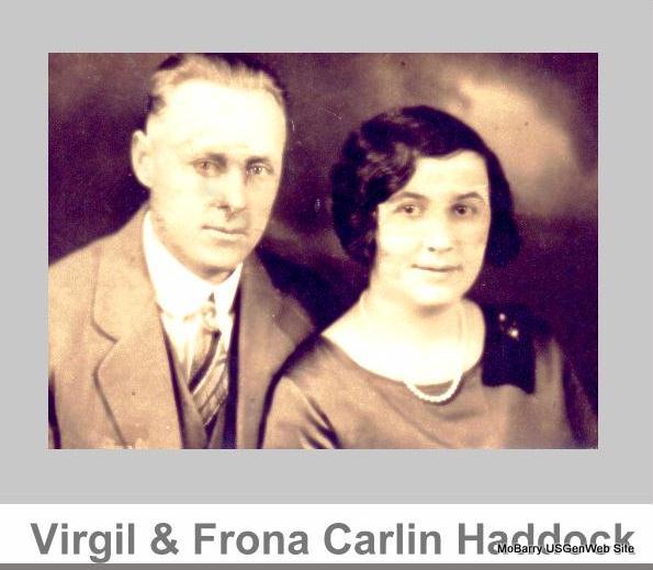 SSW: Frona J. - Research Note: His wife was Frona Joy Carlin. Samuel Virgil Haddock was a son of Samuel Sanders and Evaline (Woods) Haddock and a descendant of Charles and Sarah (Collins) Haddock. Eleanor Aldridge of Rural Cassville, MO was the informant on the death certificate. - Cassville Republican, Thursday, August 1, 1918 - Rocky Comfort: Virgil Haddock of Granby visited his parents Mr. and Mrs. Sam Haddock, here Saturday night and Sunday. - Photo of Virgil and Frona | Online Newspapers Death Certificate Phyllis Long Note Photo Donna Cooper Darla Marbut |