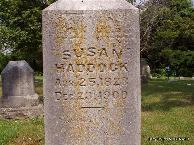 Research Note: Susan Meyers/Moyers was the daughter of Phillip and Margaret Moyers - For a view of the cemetery facing Susan's grave, click here. Susan was first married to Solomon Rumbaugh. He was born Aug. 18, 1821, Sugar Creek Twp, Armstrong, Pennsylvania, and died Aug. 13, 1850 and is said to be buried at sea. Her children by Solomon Rumbaugh were Solomon, Charlotte, and Margaret. Charlotte married Spencer Crumley, a son of Thomas and Susan Crumley; Solomon married Sarah Browning, daughter of Charles H. and Silvy (Reeves) Browning; Margaret married M. Sidney Russell, son of Milo and Nicey (Haddock) Russell and also William Marshall Carlin who was first married to Nancy Haddock, daughter of Charles and Sarah (Collins) Haddock. Susan married second Charles Haddock, Jr. by Charles she had three children. They were Richard Ransom Haddock who married Sarah Browning, daughter of William and Lucy (Udaley) Browning; Rachel Haddock who married John H. Banks; and Alonzo Haddock who married Louisa Browning, daughter of Charles and Silvy (Reeves) Browning. In 1900 Susan was age 77 and living with her son Solomon Rumbaugh in Capps Creek Twp., of Barry Co., MO. - Cassville Republican, Dec. 27, 1900 - Eagle Rock News: Mrs. Russell's mother, Mrs. Haddock, who has been visiting in this vicinity, died at the former's' home Saturday night. - Photo of Susan | Online Obit Phyllis Long Note Photo Donna Cooper Darla Marbut |