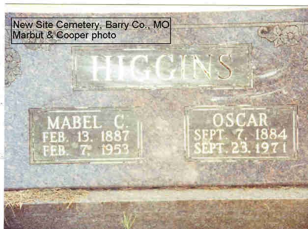SSW: Mabel - Research Note: Son of Thomas Andrew and Martha Mahala (Montgomery) Higgins. He was a Baptist minister. Rural Monett, Barry Co., MO resident. Alfred Higgins of rural Monett, MO was the informant on the death certificate. Oscar Higgins was pastor at New Site Church 1929-1931. - September 16, 1915, Thursday, Cassville Republican - New Site News: Mr. and Mrs. Oscar Higgins and Ora Higgins will leave the last of this week to resume their school week at William Jewell College at Liberty. Ora's wife and son will not go for a few weeks on account of the ill health of her mother, Mrs. D. L. Laureate. | Online Newspapers Census Death Certificate Phyllis Long Note Photo Donna Cooper Darla Marbut |