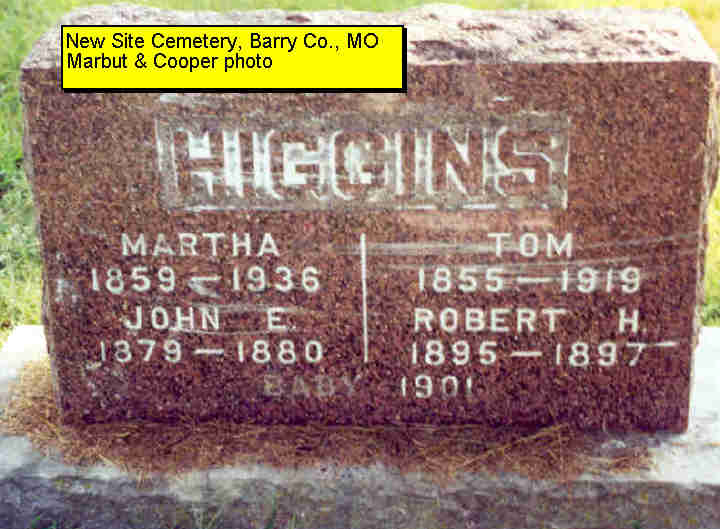 | HIGGINS, Martha Mahala (MONTGOMERY) | Jan. 6, 1859 Barry Co., MO |