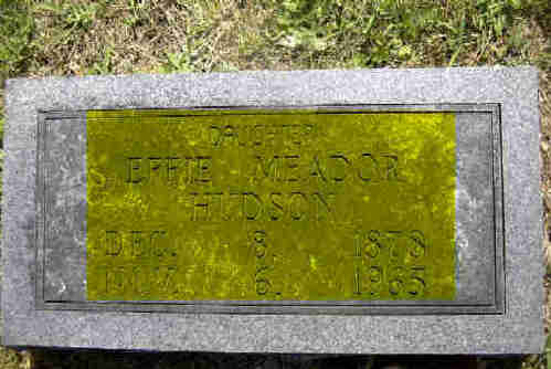 Research Note: Daughter of James Thomas Meador and Louisa Serepta Withers. Her husband was Waddie Hudson born Dec. 12, 1865 and died July 10, 1954, buried in Tahlequah, Cherokee Co., OK. Mrs. A. L. Brite of Monett, MO was the informant on the death certificate. In 1880, Effie E. was age 2 and in house #115, family # 115 of James and Louisa Meador in Capps Creek Twp., of Barry Co. Her siblings were all born in MO and were given as Sarah, age 9, Willis E,. 7, and Elmer E., age 5. They lived between Rease Vermillion and Charley Rouet. - Effie Meador married Waddie Hudson on Sept. 15, 1906 in Barry Co., MO. - Cassville Republican, Thursday, January 23, 1919 - Monett - E. E. Meador and his sister, Mrs. Effie Hudson, have gone to Muskogee and Morris, Okla., on business. | Death Certificate MO Marriage Records Census Online Newspapers Phyllis Long Photo Donna Cooper Darla Marbut |