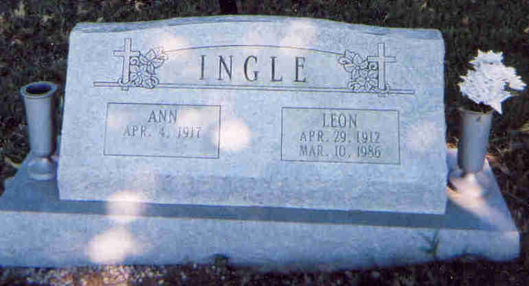 SSW: Leon - Research Note: The Ingles owned property next to the cemetery and owned what was the Walnut Grove School property. In 1873, this transaction was recorded in Barry Co. It reads: Crumley, Samuel to Walnut Grove school district, Mar. 13, 1873, T25, R28. Deed records indicate that Leon owned the land that Walnut Grove School was situated on and he lived in what was the old school house. Spencer Crumley once owned that same land. - She was the daughter of the late Calvin and Martha (McCoy) Sooter. She was united in marriage on October 8, 1937 in Jay, Oklahoma to Leon Ingle, he preceded her in death on March 10, 1986. She was preceded in death by both her parents: Calvin and Martha; husband: Leon; and one grandchild. | Bennett-Wormington Funeral Home Phyllis Long Note Donna Cooper Photo Darla Marbut |