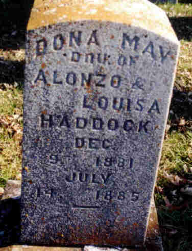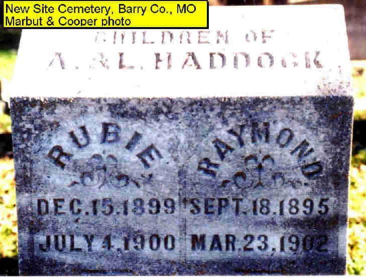 | HADDOCK, Rubie | Dec. 15, 1899 | July 4, 1900 | SSW: Raymond - Inscription: "Children of A. and L. Haddock" - Research Note: Daughter of Alonzo Haddock and Louisa Browning. | Note Photo Donna Cooper Darla Marbut |