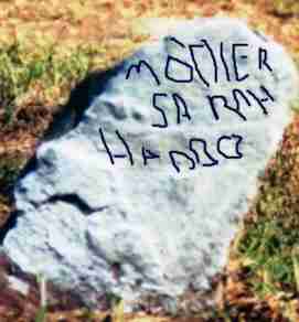 Research Note: Sarah (Collins) Haddock was the first wife of Charles Haddock, Jr. And the daughter of William Collins and Elizabeth Graham. She was the first person buried at Walnut Grove [New Site]. Her sand stone marker is near the graves of several of her children. With the help of modern day technology and the a computer photo program, the old etchings come to the surface, but there but there are not dates on it. The stone reads Mother - Sarah Haddock. To the east and at the foot of her grave is the gravesite of her infant son, Joel, who was buried about Jan or Feb of 1851. In the estate settlement of Charles Haddock, Jr., Susan, his second wife, stated that Sarah and an infant were buried on the property. | Note Photo Donna Cooper Darla Marbut |