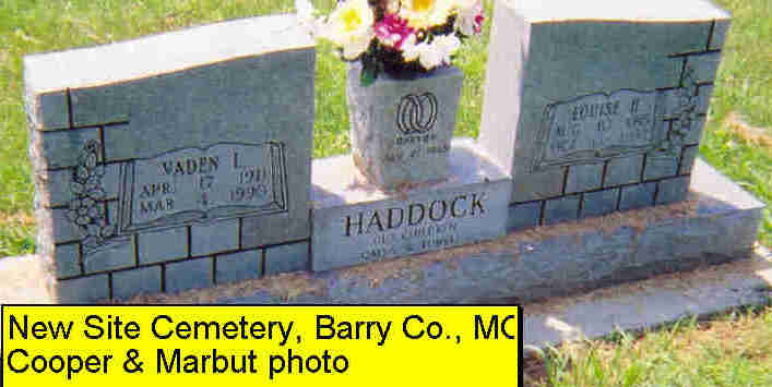 | HADDOCK, Vaden L. | Apr. 17, 1911 | Mar. 4, 1990 | SSW: Louisa Henrietta - Research Note: Son of Charles Saunders and Hattie Bell (Wormington) Haddock, Sr. In 1930 Vaden was listed in the Haddock household, in Monett, and was age 19. | Census Photo Donna Cooper Darla Marbut |