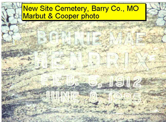 | HENDRIX, Bonnie Mae (RUMBAUGH) | Feb. 6, 1912 | June 8, 1985 | Research Note: Daughter of Ernest Alonzo and Myrtle Mae (Teel) Rumbaugh - Bonnie Mae Rumbaugh was married to Virgil Hendrix. Virgil's obituary stated that he was 94 years old when he died and that he was buried at Seligman. An abstract of that document reads: Virgil W. Hendrix, age 94, of Seligman, died yesterday, October 14, at Barry County Care Center in Cassville. Mr. Hendrix was a farmer. Services will be 1 p.m. tomorrow, October 16, at Fohn Chapel in Cassville. Burial will be in Seligman Cemetery under the direction of Fohn Funeral Home of Cassville. Visitation will be from 6 to 8 p.m. today, October 15, at the funeral. This obituary was published in full content on October 15, 2002, in the Monett Times, Monett, MO. | Monett Times Photo Donna Cooper Darla Marbut |