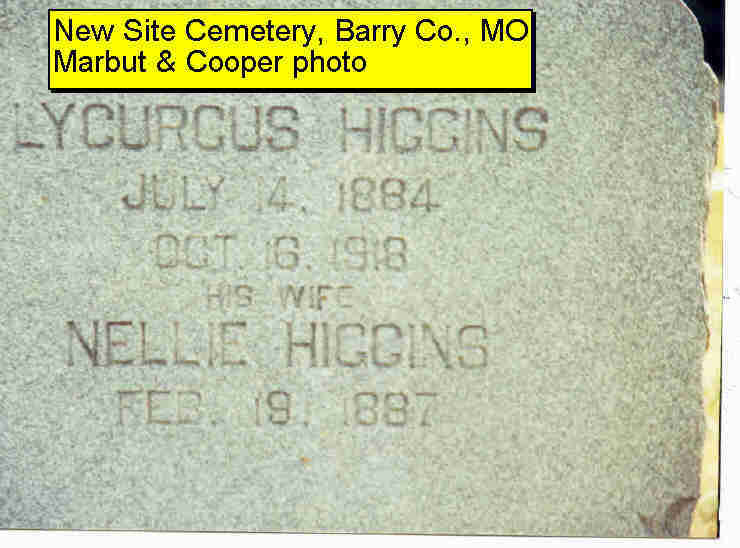 | HIGGINS, Lycurcus | July 14, 1884 | Oct. 16, 1918 | SSW: Nellie - Research Note: Son of John Monroe Higgins and Mary M. Browning, married on Sept. 23, 1883 in Barry Co., MO. Tulsa County Oklahoma District Court Marriage Books 5 and 6 Brides - 6 Mar 1910-1 Oct 1913 Moss, Nellie, Higgins, Lycurgus. WW I Draft Registration gives his address on Sept. 7, 1918 as Carlsbad, Eddy Co. NM. He was a RR brakeman and nearest relative was his wife Nell. - 1900 Census, Twin Groves, Jasper, Missouri - John M. Higgins, born Jan. 1859 IL, age 41, married 17 years, farmer; Mary, wife, born Nov. 1864 MO, age 35, married 17 years, mother of 1, 1 living; Lycurus, son, born July 1884 MO, age 15. - John Monroe Higgins was the son of Adam Higgins and Mary Jane Buntin. | WW I Reg. OK Marriage Records MO Marriage Records Census Phyllis Long Photo Donna Cooper Darla Marbut |