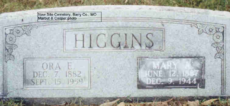 SSW: Mary A. - Research Note: Son of Martha Mahala Montgomery and Thomas Andrew Higgins. He was a retired grocer. Dr. Deonard Higgins of Kansas City, MO was the informant on the death certificate. - September 16, 1915, Thursday, Cassville Republican - New Site News: Mr. and Mrs. Oscar Higgins and Ora Higgins will leave the last of this week to resume their school week at William Jewell College at Liberty. Ora's wife and son will not go for a few weeks on account of the ill health of her mother, Mrs. D. L. Lautaret. - September 14, 1916, Thursday, Cassville Republican - Washburn Prairie: Mr. and Mrs. Ora Higgins and little son of Liberty, Mo., came Saturday night to visit his sister, Mrs. Ida Banks and family. | Death Certificate Online Newspapers Phyllis Long Photo Donna Cooper Darla Marbut |
