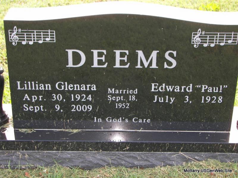 SSW: Lillian Glenara - "Inscription: Sept. 18, 1952" - Research Note: He was the son of the late Edward Francis and Jewel (Reagan) Deems. He was united in marriage on September 18, 1952 in Draton Plains, Michigan to Lillian Arnett, she preceded him in death. He was retired from Lazy Boy in Neosho, an Army veteran of World War II, and a member of the Southside Church of Christ in Monett. He was preceded in death by both his parents: Edward Francis and Jewel, and wife: Lillian. | Bennett-Wormington Funeral Home Phyllis Long Monett Historical Society Photo |