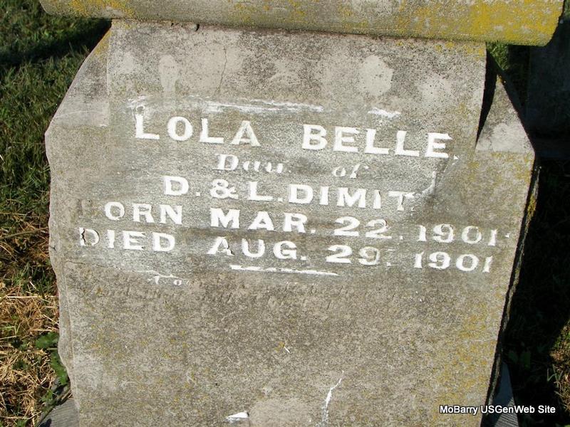| DIMIT, Lola Belle | Mar. 22, 1901 | Aug. 29, 1901 | Inscription: "Dau. of D. and L. Dimit" - Research Note: Daughter of David Dimit and Linnie James. - Another Photo - Another Photo -Another Photo | Monett Historical Society Photo |