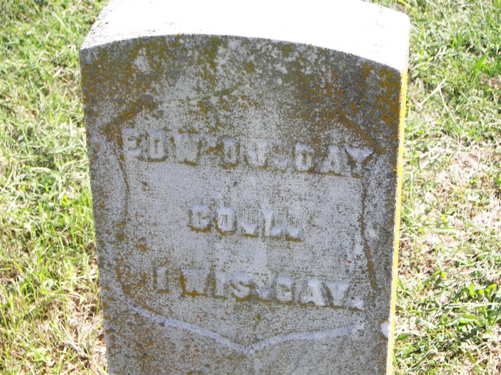 Civil War Stone Inscription: "Co. L - 1 WIS CAV" - Research Note: Buried next to William R. Day and Lill Day, his wife. Edward was appointed postmaster at Monett in July 1892. - Mustered in on Aug. 27, 1862 and out on Mar. 11, 1863. Widowed, living with his sister Mary in the 1900 census. | Monett Cemetery Records 1890 Vet Census Cassville Republican July 7, 1892 Census Phyllis Long Monett Historical Society Photo |