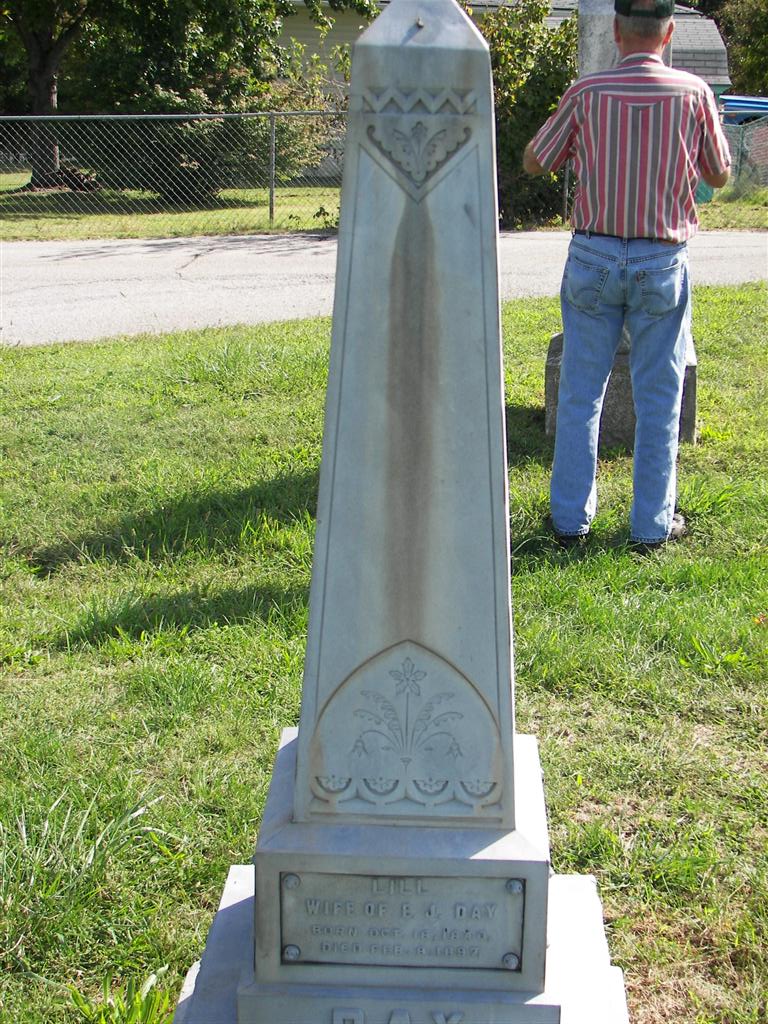 | DAY, Lill | Oct. 18, 1840 | Feb. 8, 1897 | Inscription: "Wife of E. J. Day" - Research Note: Buried next to Edward J. Day, her husband, and William R. Day. - Another Photo | Monett Cemetery Records Phyllis Long Monett Historical Society Photo |
