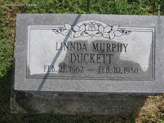 | DUCKETT, Linnda (MURPHY) | Feb. 21, 1962 | Feb. 10, 1980 | Research Note: She is listed by the City of Monett as buried in the Old Section, Potter Block, Lot N/A, Grave 1. Linda Teresa Murphy married Darryl Gene Duckett on May 24, 1979 in Lanagan, McDonald Co., MO. Ruth Perry of Neosho, MO, mother of Linda, gave consent. | Monett Cemetery Records MO Marriage Records Phyllis Long Monett Historical Society Photo |