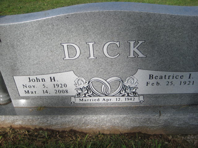 SSW: Beatrice I. - Inscription: "Married Apr. 12, 1942" - Research Note: He was a son of the late W. H. and Lorena (Boyle) Dick. John was united in marriage to Beatrice Skaggs on April 12, 1941. He was retired postmaster in Pierce City. He was an Army veteran and served in World War II. John was also preceded in death by one brother, Robert Dick. | Monett Times Mar. 17, 2008 Phyllis Long Monett Historical Society Photo |