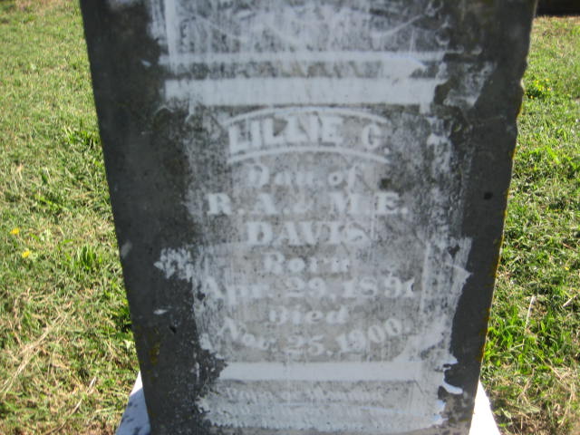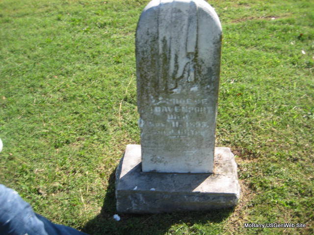 | DAVIS, Lillie G. | Apr. 29, 1891 | Nov. 25, 1900 | Inscription: "Dau. of R. A. and M. E." - Another Photo | Monett Historical Society Photo |