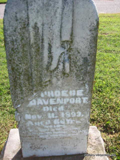 | DAVENPORT, Phoebe | Abt. 1833 | Nov. 11, 1893 | Inscription: "Aged 60Y" - Another Photo | Monett Cemetery Records Phyllis Long Monett Historical Society Photo |