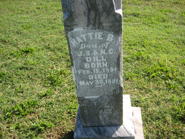 | DILL, Hattie B. | Feb. 18, 1891 | May 30, 1891 | Inscription: "Dau. of J. S. and N. C. Dill" - Research Note: She was a daughter of James Sherman and Nancy Caroline (Lambert) Dill. Monett City Cemetery notes say that Clyde and Hattie are on the same stone. | Monett Cemetery Records Phyllis Long Monett Historical Society Photo |