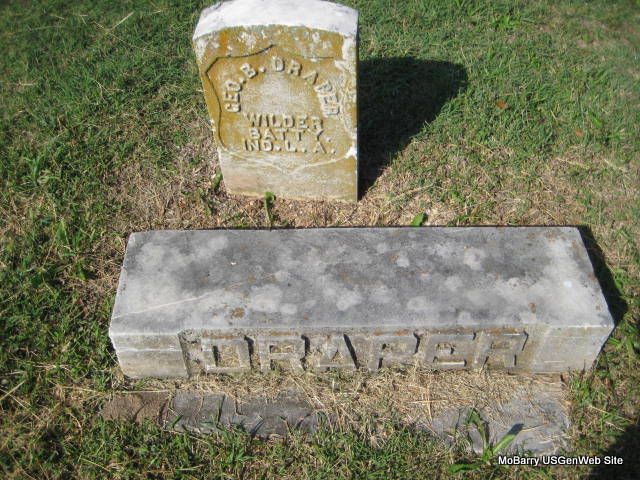 Research Note: Research Note: He is buried next to Florence and Lamberteen Draper. He was the son of Andrew J. and Eve (Montgomery) Draper. His wife was Florence E. Hamilton and they were married on Jan. 22, 1867 in Johnson Co., IN. Their children were, Lambertine, Ollie G., and Walter H. He moved to Monett, MO in 1882 and engaged in the real estate business. He was appointed notary public in 1886. In May 1887, he formed a partnership with J. L. Downing and the firm did a successful business. - Obit for son: Cassville Democrat, Saturday, Jan. 3, 1920 - Walter Draper, a Frisco engineer, died on his train, Dec. 24, near Carl Junction, age 46 years. He left a wife and one sister. He was a son of late G. B. Draper, and years ago, the Draper family resided at Exeter. His home was in Monett. - Cassville Republican October 19, 1893 - State v. G. B. Draper, embezzlement; continued by agreement. - Military Stone - Inscription: "WILDER BATTY. - IND L. A. - Another Photo | Goodspeed's 1888 History of Barry Co. Monett Cemetery Records Online Newspapers Phyllis Long Monett Historical Society Photo |