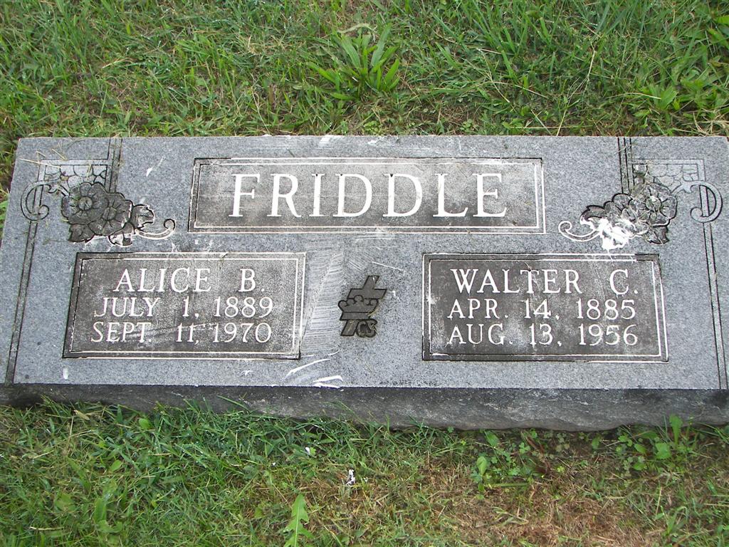 SSW: Alice B. - Research Note: His wife was Alice Friddle and she was the informant. He was the son of Charles and Julia (Stephens) Friddle and a retired Frisco Railroad Engineer. - Walter D. Friddle married Alice McCubbin on July 26, 1909 by Rev. Luther Carlin, MG. | Death Certificate Barry Co., MO Marriages Phyllis Long Monett Historical Society Photo |