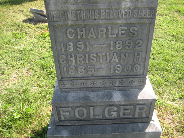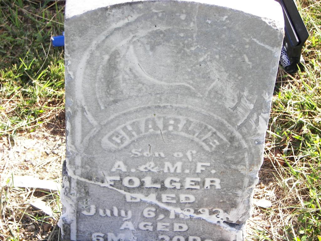 | FOLGER, Charlie F. | 1891 | July 6, 1892 | Inscription: "Son of A. and M. F. Folger - Aged 6 Mo. 20 Ds." - Another Photo SSW: Christian H. on this stone and named as Charles. | Monett Historical Society Photo |
