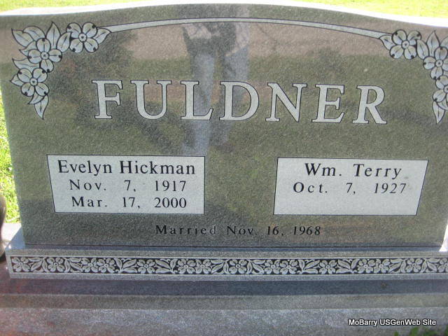 SSW: William Terry - Inscription: "Married Nov. 16, 1968" - Back of Stone - Research Note: She was the daughter of Eugene and Dicey (Davies) Hickman. She moved to Monett in 1968 from South Pasadena, California, was a homemaker, and worked as a Legan Libriania for Mobil Oil Corporation. She married Terry Fuldner on November 16, 1968. She was his second wife. | Monett Times Mar. 20, 2000 Phyllis Long Monett Historical Society Photo |