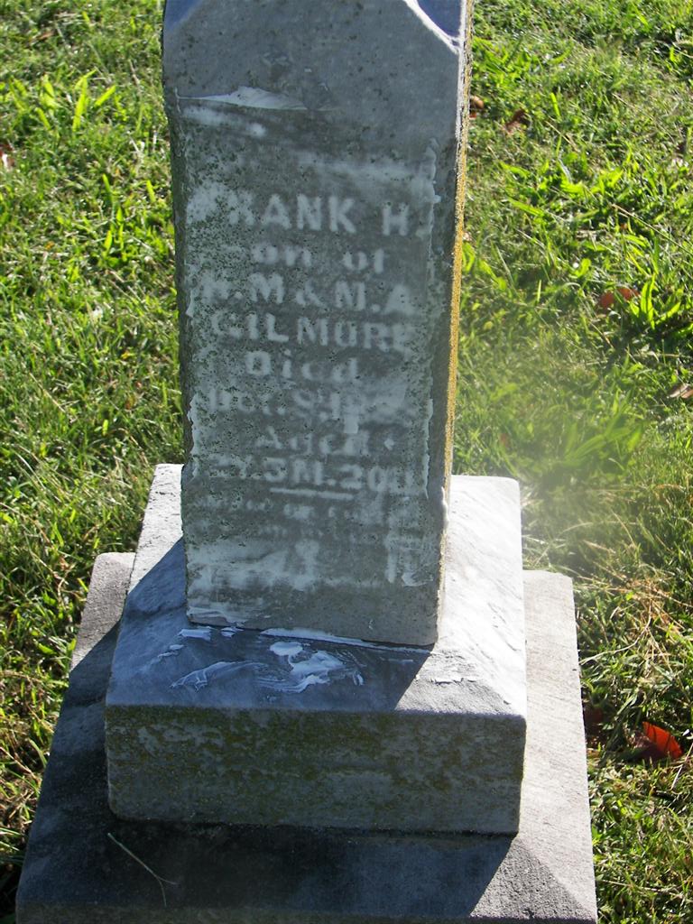 | GILMORE, Frank H. | No Date | Oct. 8, 188? | Inscription: "Son of H. M. and M. A. Gilmore - Aged 2Y, 3M, 20D" - Research Note: Son of Harvey Moore and Mary A. Gilmore. | Note Phyllis Long Monett Historical Society Photo |