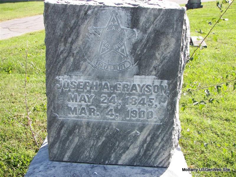 | GRAYSON, Joseph A. | May 24, 1845 | Mar. 4, 1900 | Inscription: "G.A.R. - 1861-1866" - Research Note: His death date is listed in the Death Notices of Members of Fraternal Orders, IOOF Hutchinson, Reno Co., KS, Lodge No. 99. - Joseph A. Grayson, age 47, married Laura M. Jenkins, age 21, on Mar. 6, 1892 in Barry Co., MO. - 1900 Census, Pierce, Lawrence, Missouri - Laura Grayson, age 28, born June 1871 OH, widowed, no children. | MO Marriage Records Census IOOF Records Phyllis Long Monett Historical Society Photo |