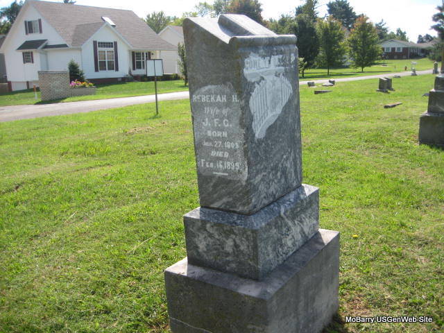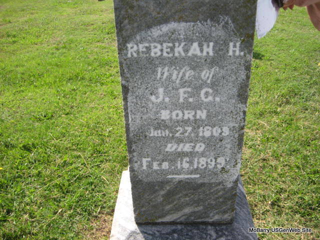 Inscription: "Wife of J. F. G." - Research Note: Notes say she was a mail order bride. Researchers say she was a daughter of Jacob Bryan and Nancy Freeman. Rebekah Bryan married John F. Goldsborough on Jan. 30, 1832 in Ripley Co., IN. - Plot Stone - Another Photo | Monett Cemetery Records IN Marriage Records Phyllis Long Monett Historical Society Photo |
