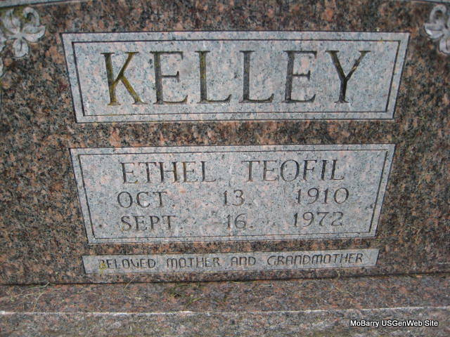 | KELLEY, Ethel Teofil (CARLSON) | Oct. 13, 1910 | Sept. 16, 1972 | Inscription: "Beloved Mother and Grandmother" - Research Note: Daughter of Anton Carlson and Nellie M. Jones. Wife of Lowell Kelley, died in 1989 and is buried at Springfield National Cemetery, Springfield, Greene Co., MO. - Back of Stone | Census Phyllis Long Monett Historical Society Photo |