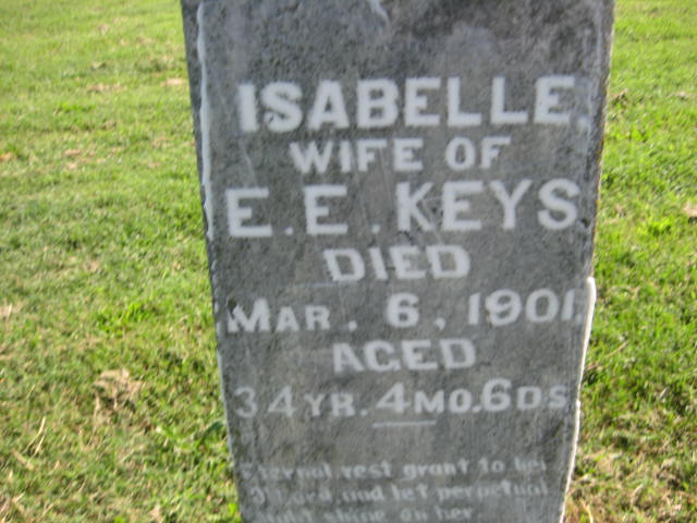 Mar. 6, 1901 | Inscription: "Wife of E. E. Keys - Aged 34 Yr - 4 Mo. - 6Ds." - Research Note: Edward E. Keys, age 22, married Isabelle Bacon, age 21, on July 28, 1997 in Mills Co., IA. Daughter of James Bacon and Mary J. Bange. Wife of Edward E. Keys. Edward was the son of Charles Keys and Alice Bammer. | Census IA Marriage Records Phyllis Long Monett Historical Society Photo |