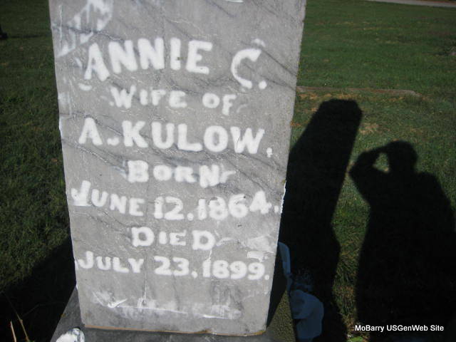 | KULOW, Annie C. | June 12, 1864 | July 23, 1899 | Inscription: "Wife of A. Kulow" | Monett Historical Society Photo |