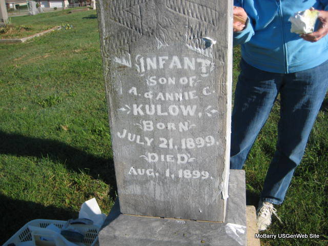 | KULOW, "Infant" | July 21, 1899 | Aug. 1, 1899 | Inscription: "Infant son of A. and Annie C. Kulow" | Monett Historical Society Photo |