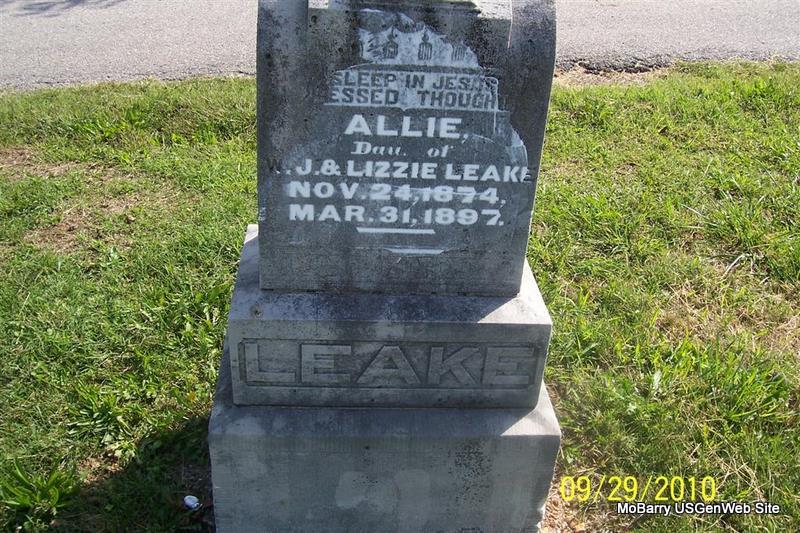 | LEAKE, Allie | Nov. 24, 1874 | Mar. 31, 1897 | Inscription: "Dau. of W. J. and Lizzie Leake" - Research Note: Cassville Republican, Apr. 9, 1897 - Mr. and Mrs. R. A. Gardner, I. B. Jones, and C. D. Manley accompanied Mr. and Mrs. Leake and family, Thursday, to Monett, with the remains of Miss Allie Leake, that were taken there for interment. | Online Newspapers Phyllis Long Monett Historical Society Photo |